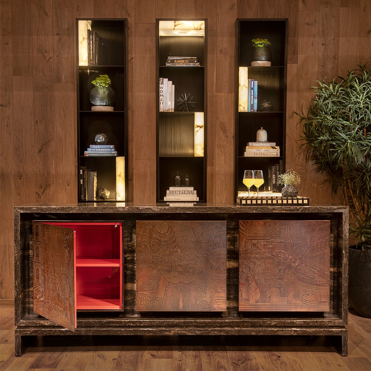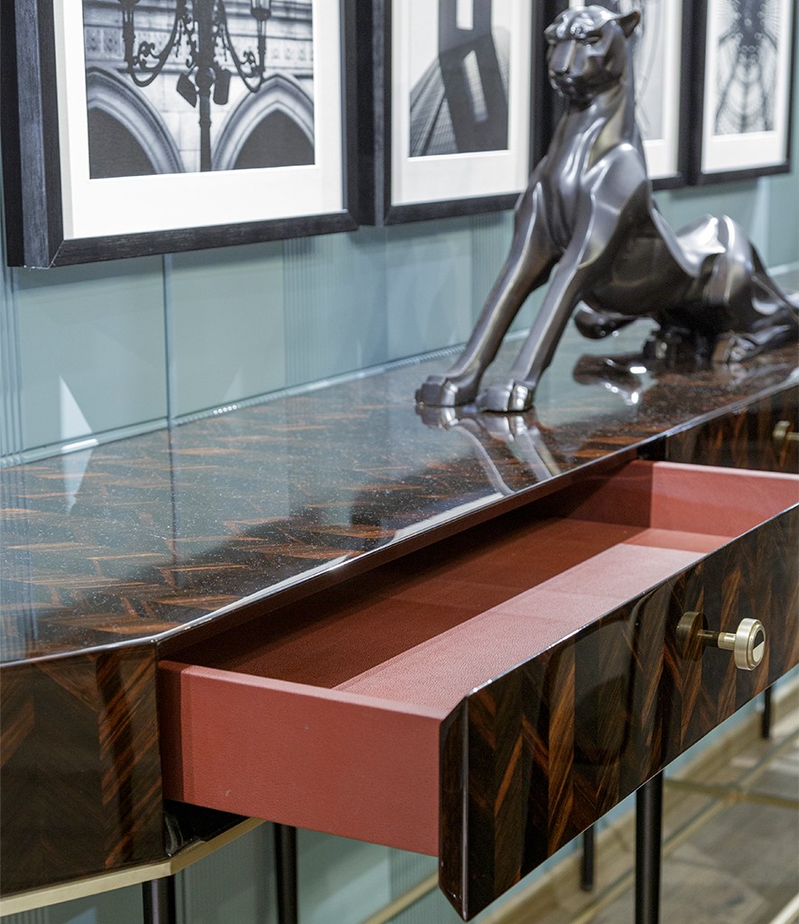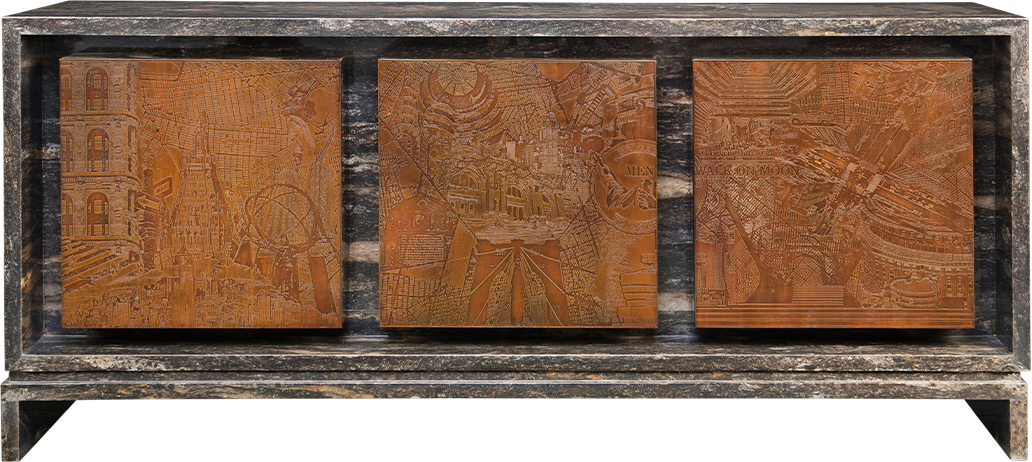The Empire State sideboard, resonates with the spirit and vibrancy of New York. This Art Furniture piece captures the nuances of the city’s architecture and highlights and their mesmerising details. With an underlying texture of the maps of NYC, the shutters in antique brass etching are a representation of buildings in the New York skyline. Framed in a granite structure, the metallic art shutters get the attention they deserve. A peep within reveals a dramatic glossy red.